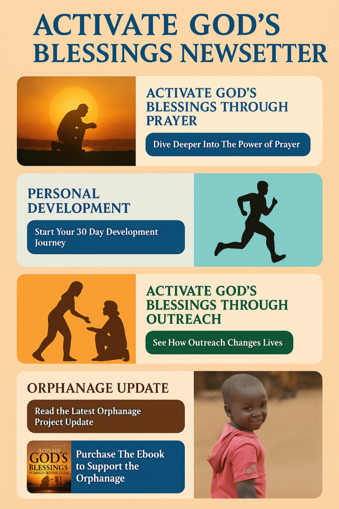 The Activate God’s Blessings Newsletter is a monthly source of spiritual empowerment designed to uplift, equip, and inspire believers through prayer-focused devotionals, personal development insights, and real-life evangelistic outreach stories. Each issue is packed with scripture-based encouragement, practical faith-building strategies, testimonies from the mission field, and updates on our African orphanage project. Whether you’re growing in your walk with God, seeking to serve others, or looking for ways to activate your own blessings, this newsletter is your monthly guide to living a purpose-filled, faith-driven life.